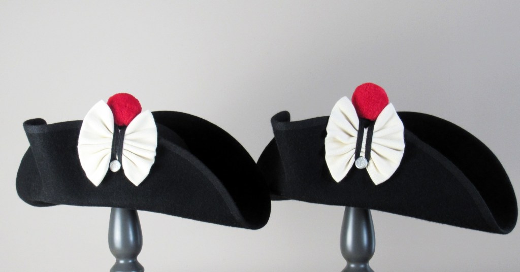 At present, sadly, we have no evidence for le Gatinois wearing bonnets de peau at Yorktown. We have therefore have chosen to abide by the 1779 Reglemente for our chapeaux, which are wonderfully made by @M. Brenckle, Hatter. They feature the white cockade of the reglemente (and not the tricolour entente cockade which was issued to Rochambeau’s force), the red “hoppe ronde” to denote our grenadier status, and the hooks and eyes which are characteristic of the French cocked hats. But who knows – maybe one day we will be seen in bonnets de peau, with Gatinois purple plumes…