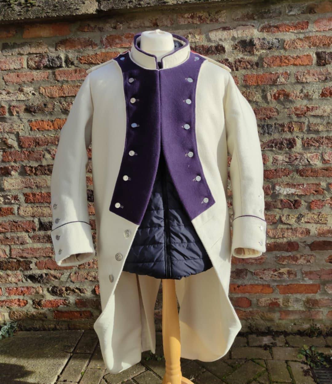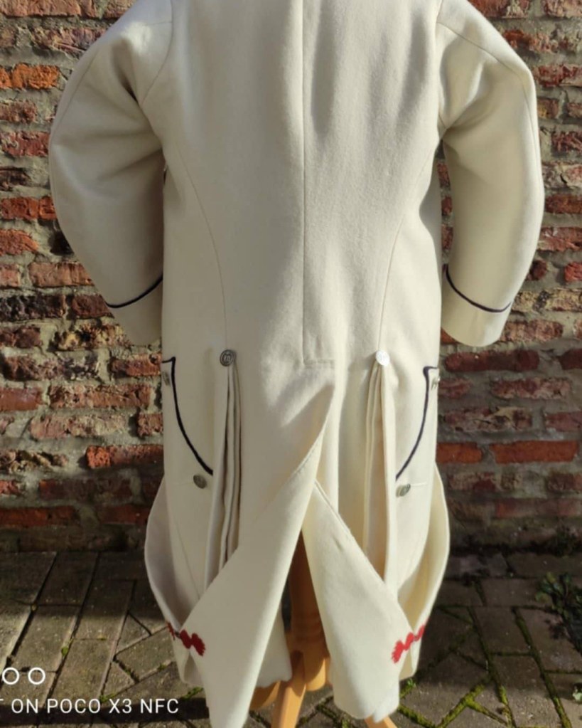 With the first of our regimental coats (or “habit”, pronounced a-bi) completed, we wanted to take the opportunity to talk a little about a few of the finer details. The garment itself is built to last (many of the edges are piped, rather than left raw) and for good reason. The French army only issued a soldat a new one every 3 years, compared to the British annual issue. But why? The answer actually lies in the same reason that the habite is white: because it’s cheap!