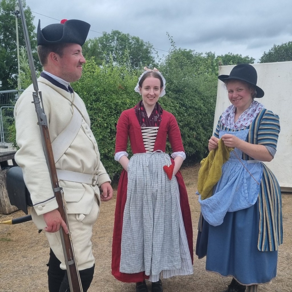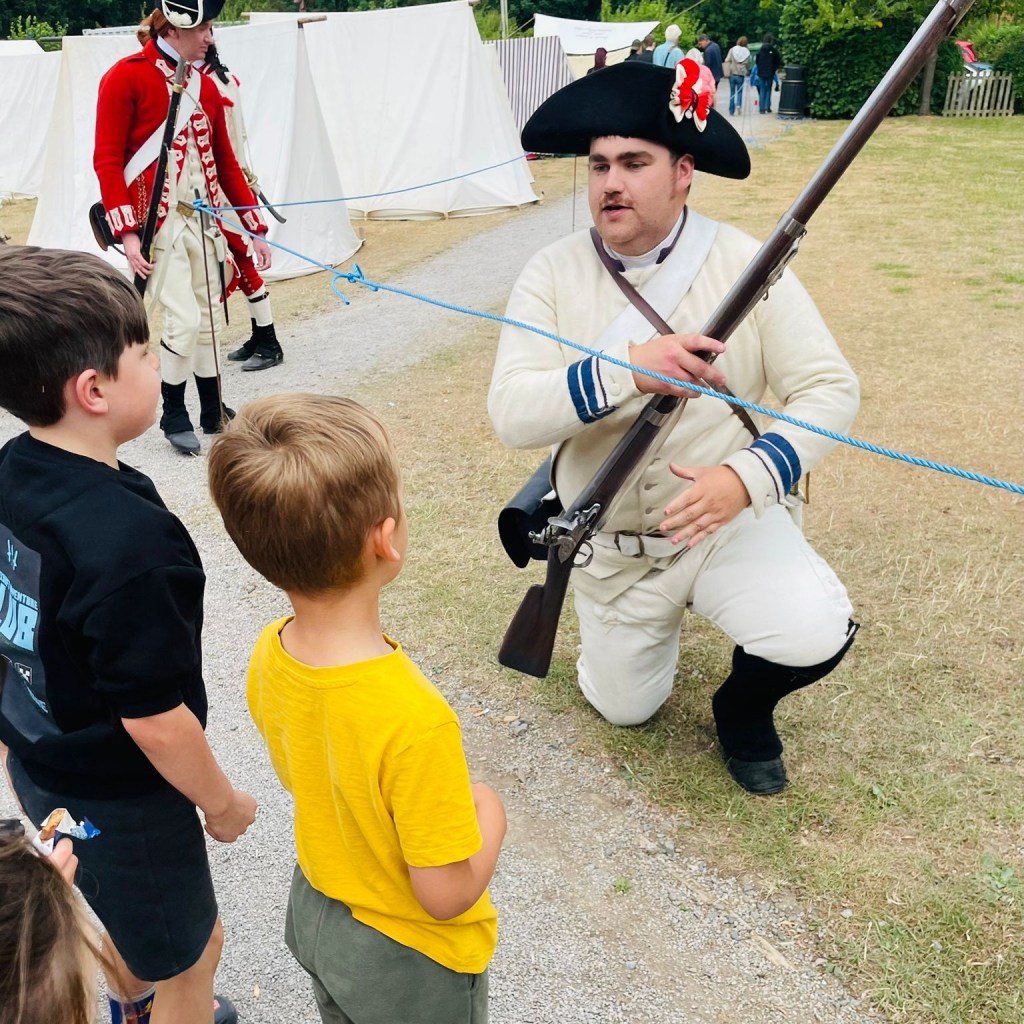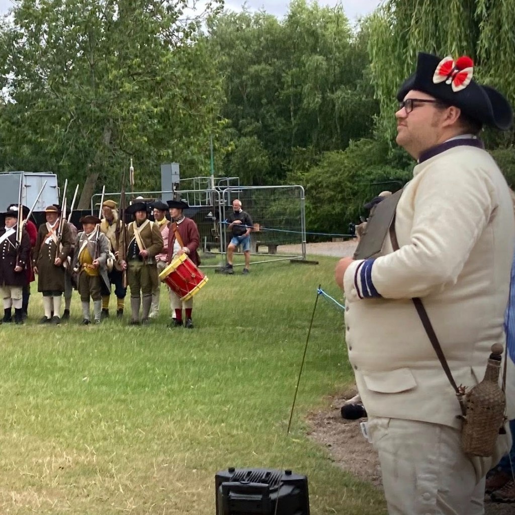 Our latest visit to Moira Furnace Museum and Country Park was a little different to our previous outings. We provided our usual demonstration of French uniform and weaponry, sentry duties, and continual public engagement…but this time the main scenario was set around Lexington and Concord in 1775, so we were not able to participate in the skirmish demonstration. Instead, our soldats helped keep the public safe from musket fire – and le Caporal stepped in to narrate the action!