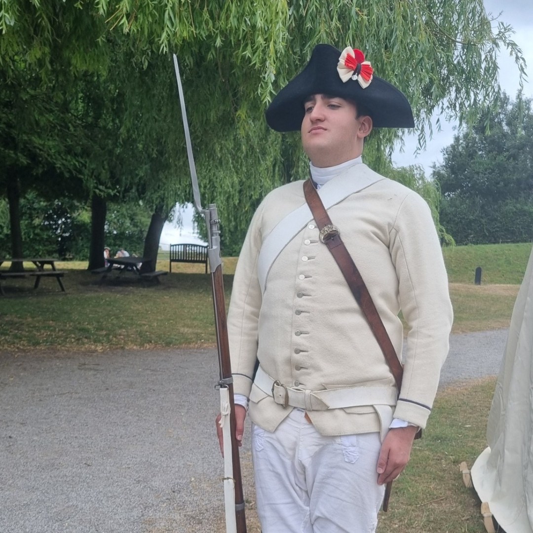 Our latest visit to Moira Furnace Museum and Country Park was a little different to our previous outings. We provided our usual demonstration of French uniform and weaponry, sentry duties, and continual public engagement…but this time the main scenario was set around Lexington and Concord in 1775, so we were not able to participate in the skirmish demonstration. Instead, our soldats helped keep the public safe from musket fire – and le Caporal stepped in to narrate the action!